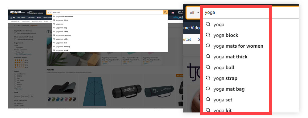 Now let's go to Amazon.com and type in "yoga" into the search bar but don't press enter. As you type notice how there are plenty of suggested search terms popping up such as "yoga block","yoga mats for women", "yoga mat thick" and so on. These are related accessories that people are searching for, and more importantly buying which gives you plenty of opportunities to earn commissions as an affiliate.