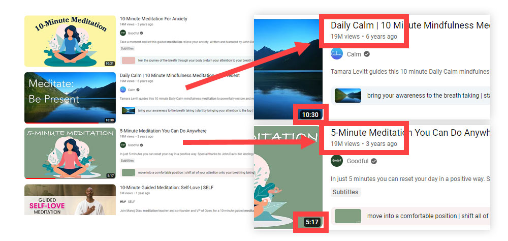 There's a video titled "5-Minute Meditation You Can Do Anywhere" that's got over 19 million views! It's only 5:17 minutes long and most of the video is just a plain green background with a voice-over. Scroll down and you'll see another video titled "Daily Calm | 10 Minute Mindfulness Meditation" that's got over 19 million views as well! It's only 10:30 minutes long and shows one lake scene with a soft voice-over.